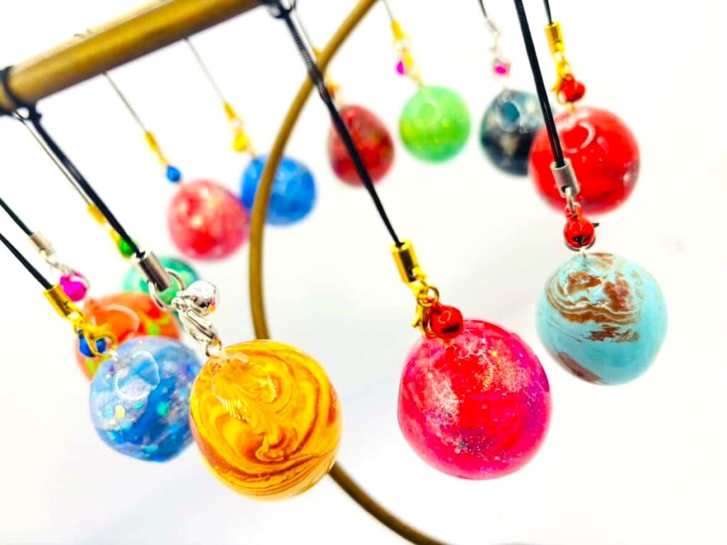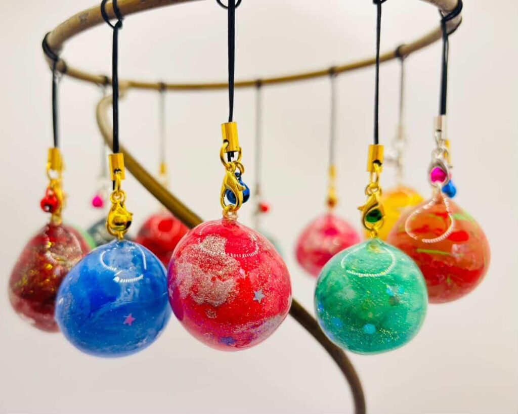 色とりどりのマーブル模様が織りなすファンタジックなアートマジック!カラフルでオンリーワンな球体が魅力のストラップとなっています。特に女性や子どもさんに大人気の商品!!。店舗での販売はなくワークショップ限定となっております。どんな模様にするかはアナタ次第!家族みんなで、友達同士で、カップルで、などなどみなさんぜひSAKURA+へお越しください。